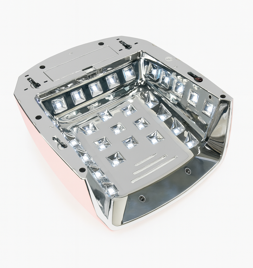 Ein integrierter Spiegelboden sowie eine verspiegelte Decke im Inneren sorgen für eine gleichmäßige Lichtverteilung von allen Seiten. Dadurch wird das UV-/LED-Licht optimal reflektiert und umgibt den gesamten Nagel – auch von unten. Das Ergebnis: makellos ausgehärtete Modellagen ohne Schattenbildung oder ungehärtete Ränder.